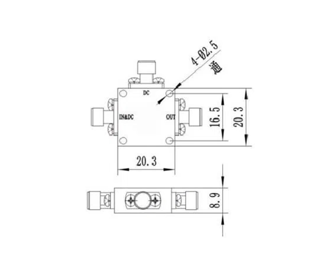 Bias Tee integrates T-type bias chip with frequency range covering 0.1-1.0 GHz, typical insertion loss 0.1dB. On-chip choke inductor has parasitic resistance of 5Ω. It can power the chip through inductor and add DC-blocking capacitor at output to achieve DC signal isolation.